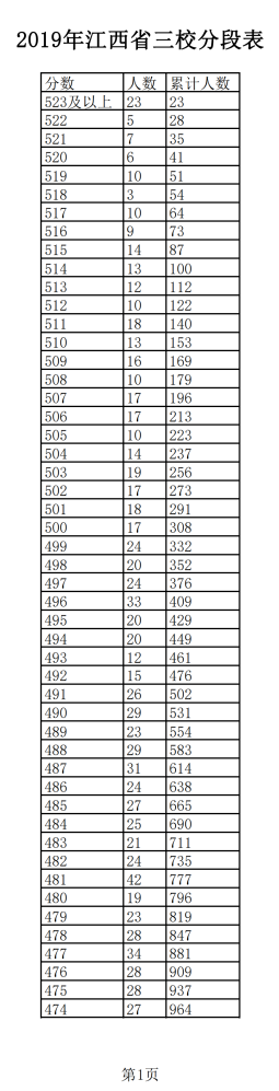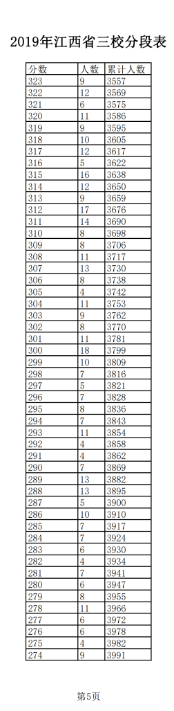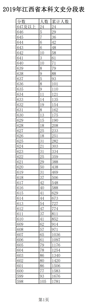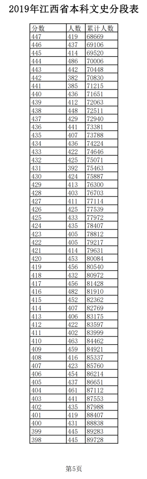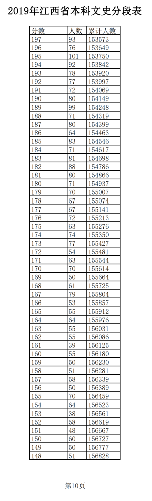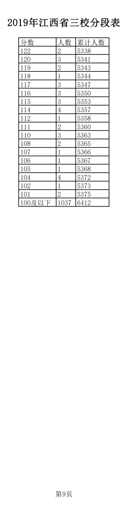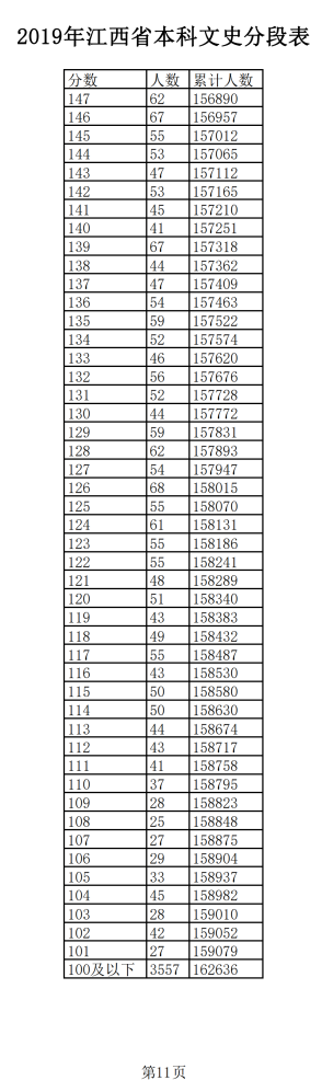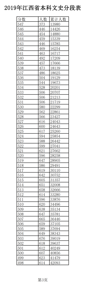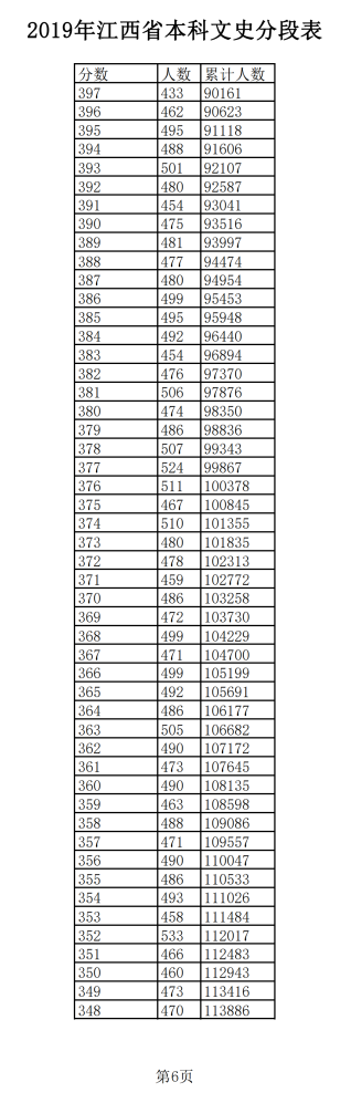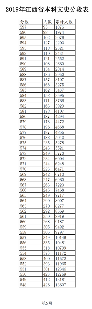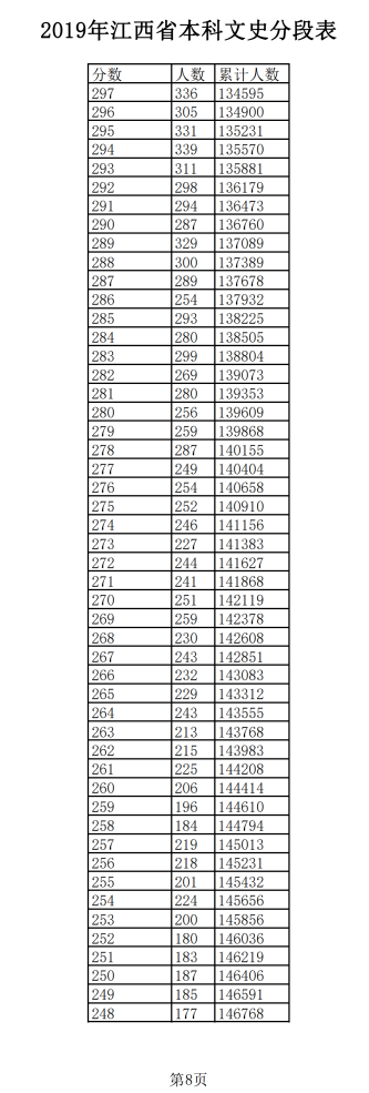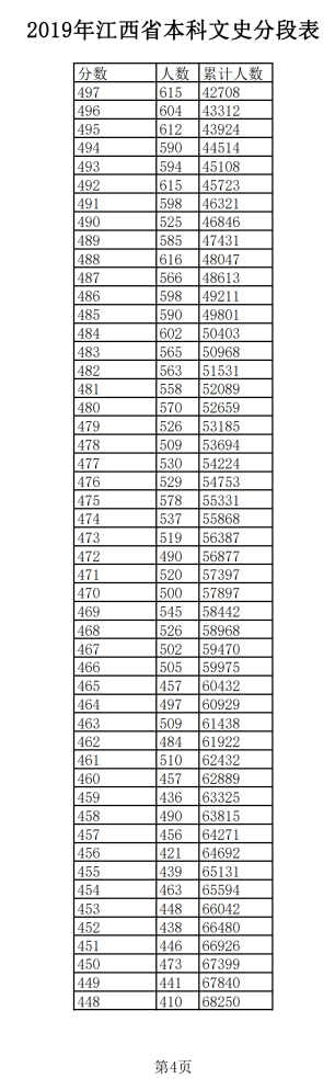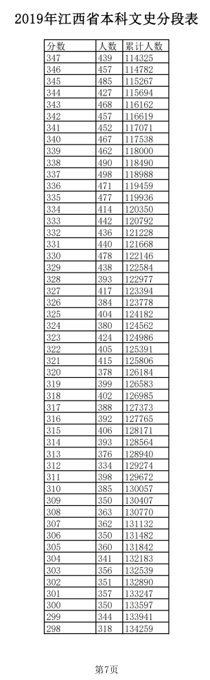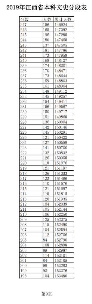 2019年江西普通高考文科成績分段統(tǒng)計表