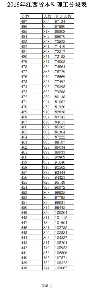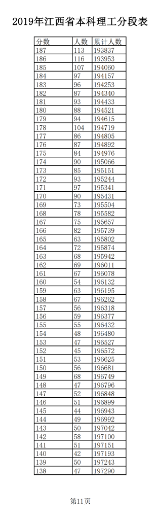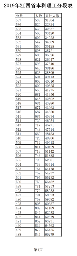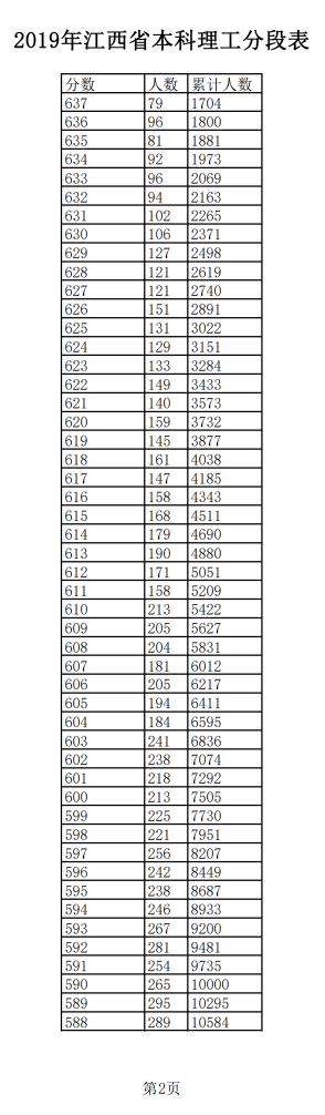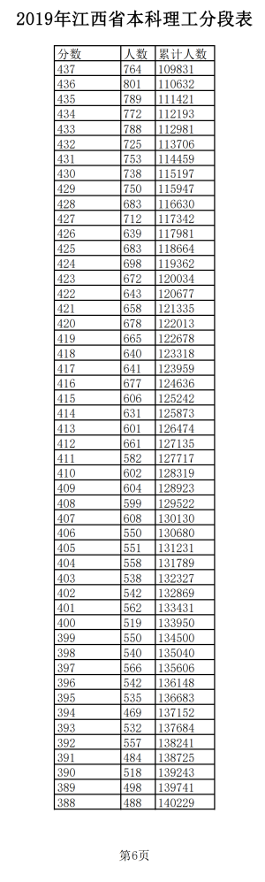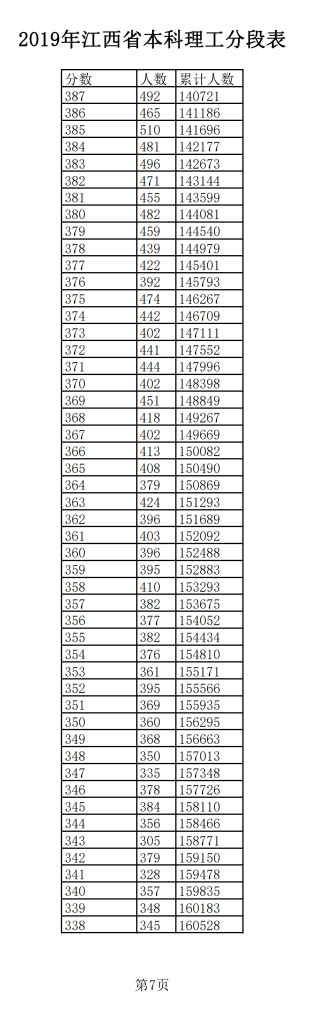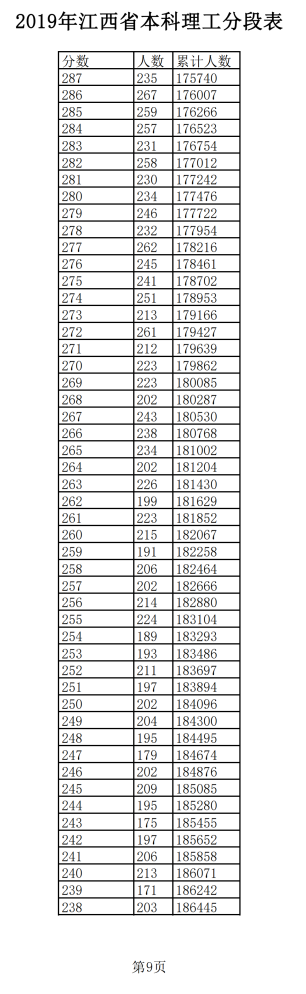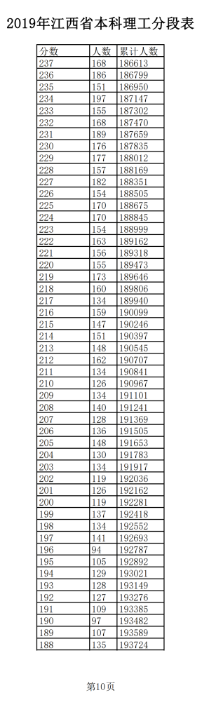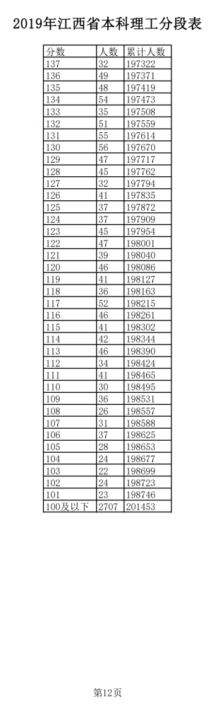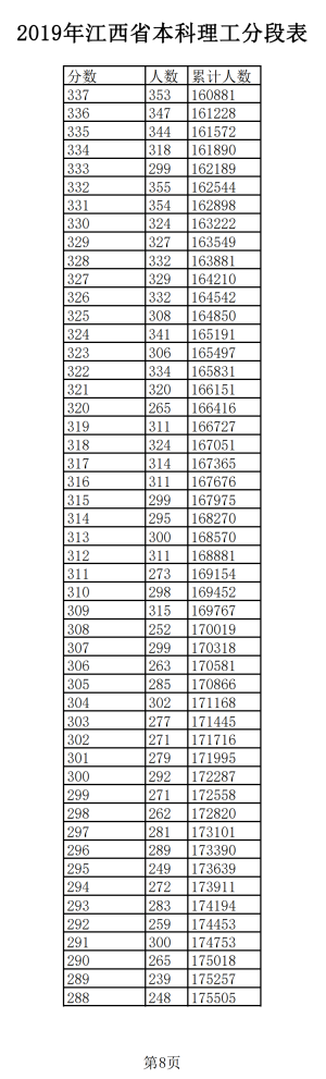 2019年江西普通高考理科成績分段統(tǒng)計表