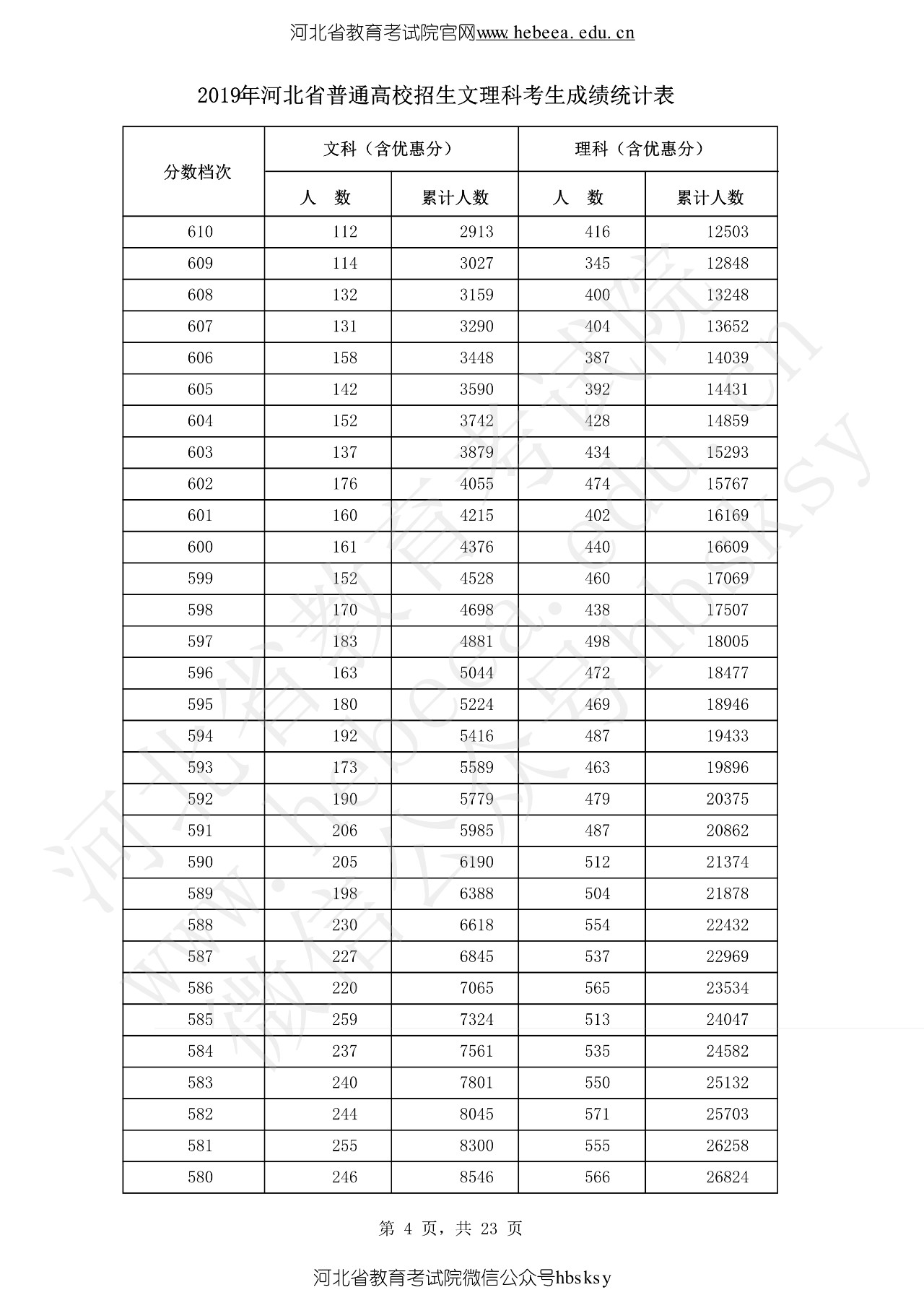 2019年河北省普通高校招生文理科考生成績統(tǒng)計表