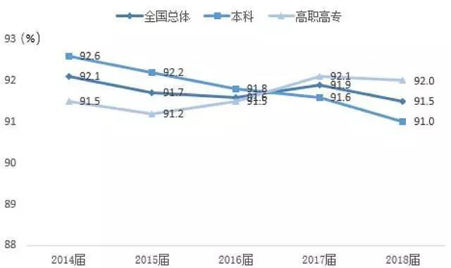 1.本科就業(yè)率持續(xù)緩慢下降,高職高專(zhuān)就業(yè)率穩(wěn)中有升