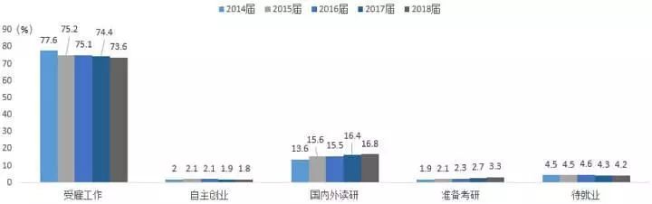 圖1 2014~2018屆大學(xué)畢業(yè)生就業(yè)率變化趨勢(shì)2.由于深造比例持續(xù)上升,畢業(yè)生待就業(yè)壓力未明顯增加2018屆本科畢業(yè)生“受雇工作”的比例為73.6%,連續(xù)五屆持續(xù)下降;“自主創(chuàng)業(yè)”的比例(1.8%)較2014屆(2.0%)略有下降;“正在讀研”(16.8%)及“準(zhǔn)備考研”(3.3%)的比例較2014屆分別增長(zhǎng)3.2個(gè)、1.4個(gè)百分點(diǎn)(圖2)。