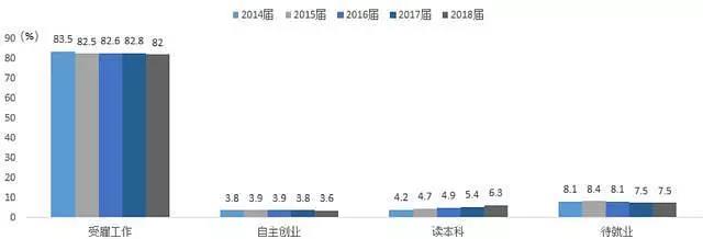 2018屆高職高專(zhuān)畢業(yè)生“受雇工作”的比例為82.0%,較2014屆下降1.5個(gè)百分點(diǎn);“自主創(chuàng)業(yè)”的比例(3.6%)較2014屆(3.8%)略有下降;“讀本科”的比例(6.3%)連續(xù)五屆上升,較2014屆增長(zhǎng)2.1個(gè)百分點(diǎn)(圖3)。