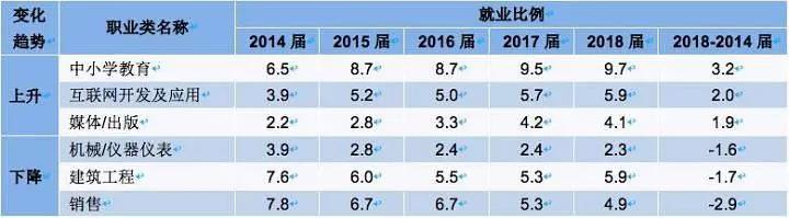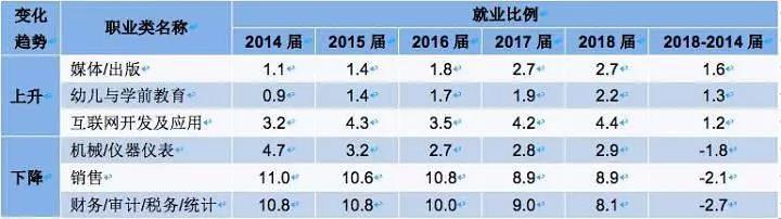 表7 2014~2018屆本科畢業(yè)生就業(yè)比例上升、下降最多的前三位職業(yè)類(lèi)
