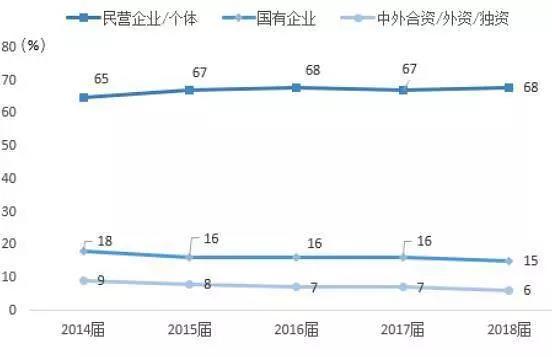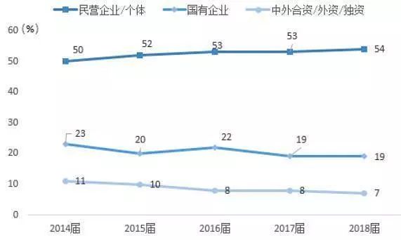 圖4 2014~2018屆本科畢業(yè)生在“民營(yíng)企業(yè)/個(gè)體”“國(guó)有企業(yè)”“中外合資/外資/獨(dú)資”企業(yè)就業(yè)的比例變化趨勢(shì)
