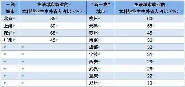 在“新一線(xiàn)”城市就業(yè)的應(yīng)屆本科畢業(yè)生中,外省籍畢業(yè)生占比從2014屆的27.9%上升到了2018屆的37.3%。在主要的“新一線(xiàn)”城市中,在杭州就業(yè)的本科畢業(yè)生中外省籍占比(60%)最高,其次為天津(58%),均超過(guò)一線(xiàn)城市中的廣州(45%)(表9)。