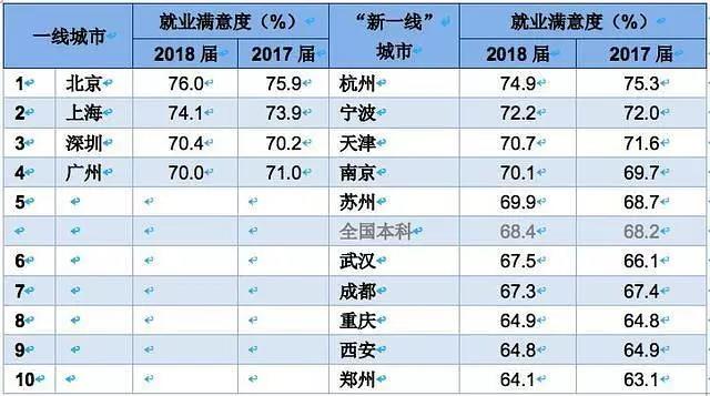 表10 2017屆、2018屆本科畢業(yè)生在各主要城市就業(yè)的滿(mǎn)意度情況