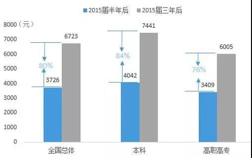 在本科學(xué)科門(mén)類(lèi)中,2015屆畢業(yè)生三年后月收入最高的是工學(xué),為8169元,高出該學(xué)科門(mén)類(lèi)半年后月收入(4313元)3856元,漲幅為89%;三年后月收入最低的是教育學(xué)(6093元),高出該學(xué)科門(mén)類(lèi)半年后月收入(3698元)2395元,漲幅為65%。在高職高專(zhuān)專(zhuān)業(yè)大類(lèi)中,2015屆畢業(yè)生三年后月收入最高的是電子信息大類(lèi),為6901元,高出該專(zhuān)業(yè)大類(lèi)半年后月收入(3673元)3228元,漲幅為88%;三年后月收入最低的是文化教育大類(lèi)(5160元),高出該專(zhuān)業(yè)大類(lèi)半年后月收入(3227元)1933元,漲幅為60%。