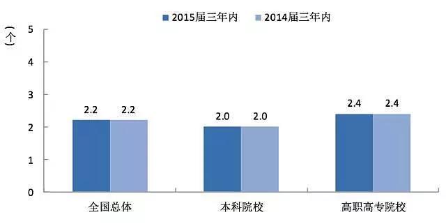 圖14 2015屆大學(xué)生畢業(yè)三年內(nèi)的平均雇主數(shù)(與2014屆三年內(nèi)對(duì)比)