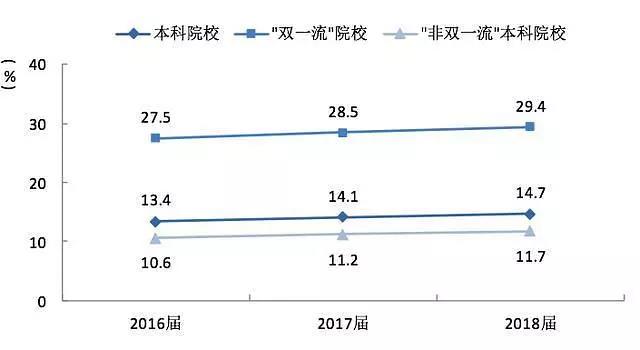 本科畢業(yè)生國(guó)內(nèi)讀研比例與上屆基本持平;主要?jiǎng)訖C(jī)是就業(yè)和職業(yè)發(fā)展需要2018屆本科畢業(yè)生國(guó)內(nèi)讀研的比例為14.7%。其中,“雙一流”院校2018屆畢業(yè)生國(guó)內(nèi)讀研的比例為29.4%,非“雙一流”本科院校2018屆畢業(yè)生國(guó)內(nèi)讀研的比例為11.7%(圖15)。