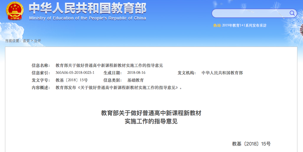 教育部印發(fā)《關(guān)于做好普通高中新課程新教材實施工作的指導(dǎo)意見》指出,從2019年秋季學(xué)期起,全國各省(區(qū)、市)分步實施新課程、使用新教材。2022年秋季開學(xué),全國各?。▍^(qū)、市)均啟動實施新課程新教材。