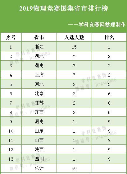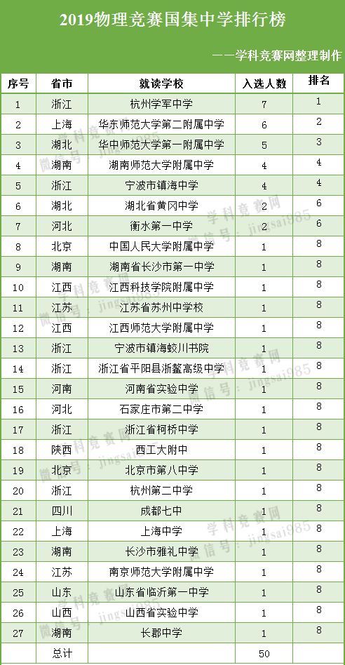 和往年一樣,今年共有50人進入物理國集隊,這50人分別來自于27所中學(xué)和13個省市。