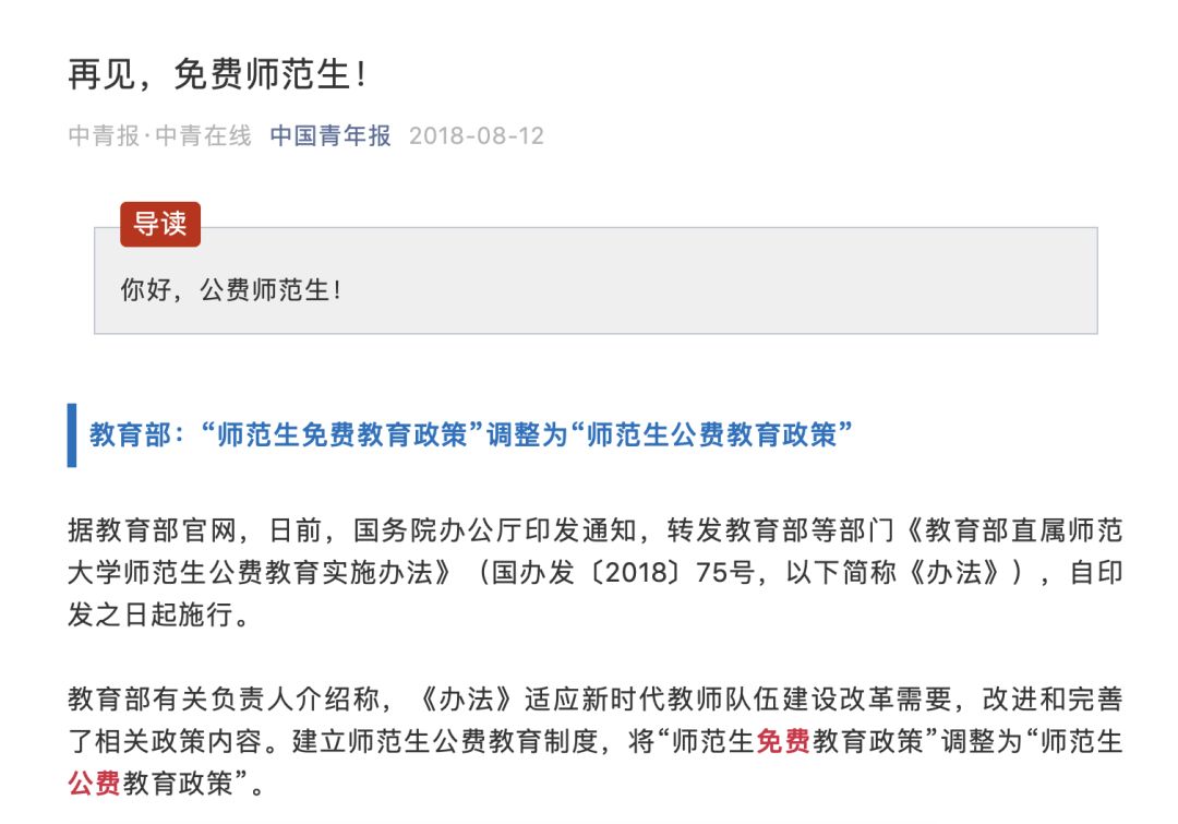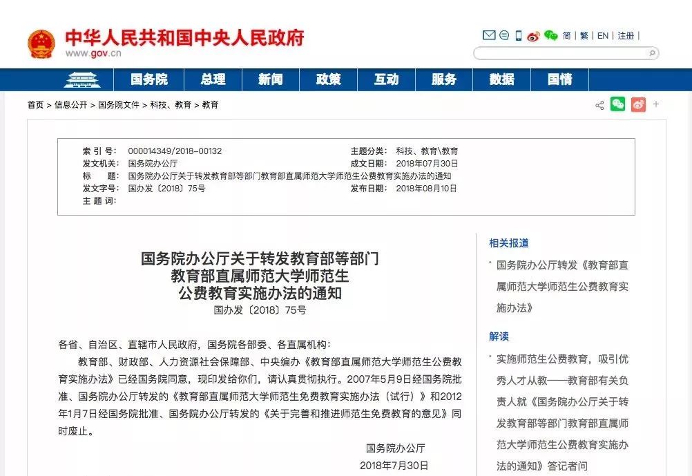 2018年8月,國務院辦公廳印發(fā)通知,轉(zhuǎn)發(fā)教育部等部門《教育部直屬師范大學師范生公費教育實施辦法》(國辦發(fā)〔2018〕75號,以下簡稱《辦法》),自印發(fā)之日起施行。