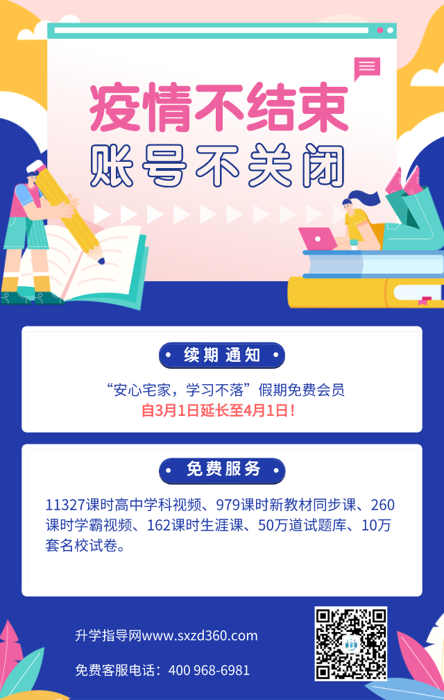 ? ? ? 隨著時(shí)間的流逝,免費(fèi)試用截止日期(3月1日)馬上到來,我司承諾“疫情不結(jié)束,賬號(hào)不關(guān)閉”!升學(xué)指導(dǎo)網(wǎng)決定將賬號(hào)延期至4月1號(hào)。為更多孩子提供免費(fèi)的優(yōu)質(zhì)學(xué)科課程服務(wù),在家聽課不停學(xué)。