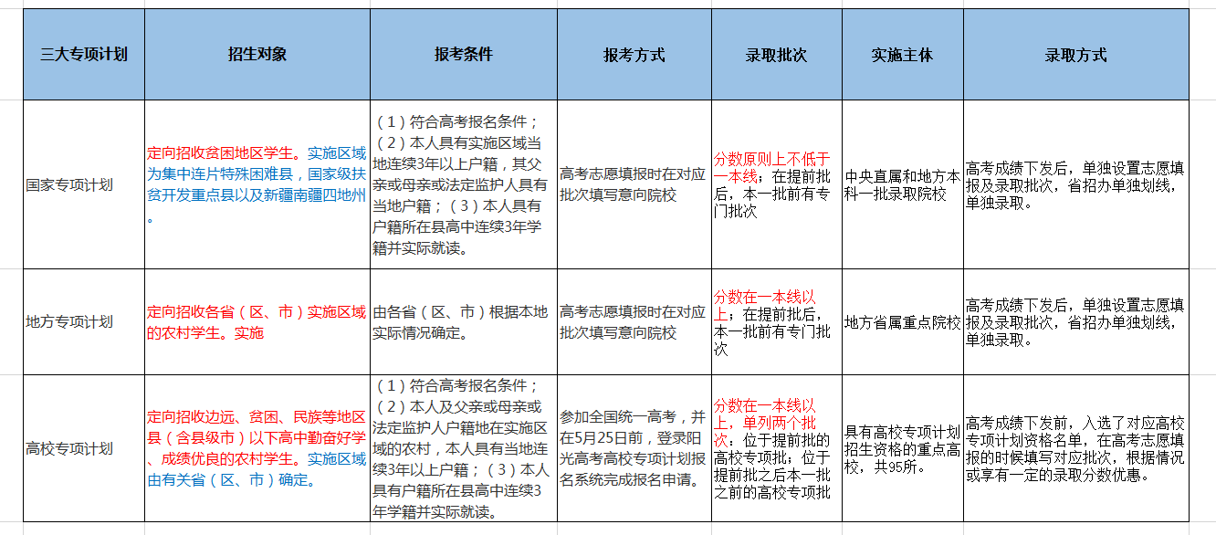 高校專項(xiàng)計(jì)劃:主要招收邊遠(yuǎn)、貧困、民族等地區(qū)縣以下的農(nóng)村學(xué)生。實(shí)施區(qū)域由各省(區(qū)、市)根據(jù)本省情況確定。