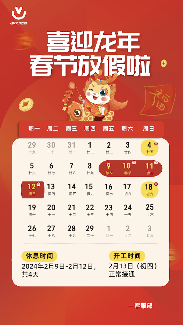 您好!在2月9日-2月12日(農(nóng)歷臘月三十-正月初三)期間,客服人員將休息。
