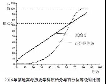 圖1 2016某地高考?xì)v史學(xué)科原始分與百分位等級(jí)對(duì)比圖