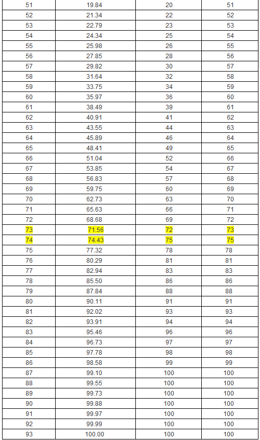 ?。?)通過“百分位等級(jí)”轉(zhuǎn)換確定原始分對(duì)應(yīng)的百分位等級(jí),并確定拐點(diǎn)分值。