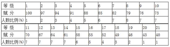 具體等級(jí)比例和賦分值: