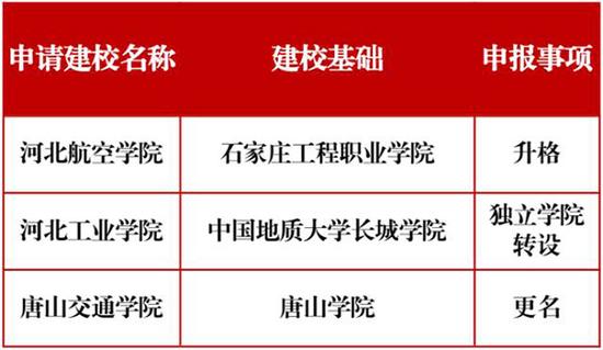 2017年10月16日,河北省教育廳發(fā)布關(guān)于2017年列入專家考察的申報設(shè)置高等學(xué)校的公示,將組織省高校設(shè)置評議委員會專家對中國地質(zhì)大學(xué)長城學(xué)院申請轉(zhuǎn)設(shè)為河北工業(yè)學(xué)院、石家莊工程職業(yè)學(xué)院升格為河北航空學(xué)院、唐山學(xué)院更名為唐山交通學(xué)院申報事項進行實地考察。