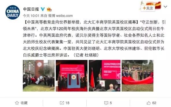 據(jù)@中國日報報道,北京大學(xué)120周年校慶海外慶典暨北京大學(xué)英國校區(qū)啟動儀式在牛津舉行。