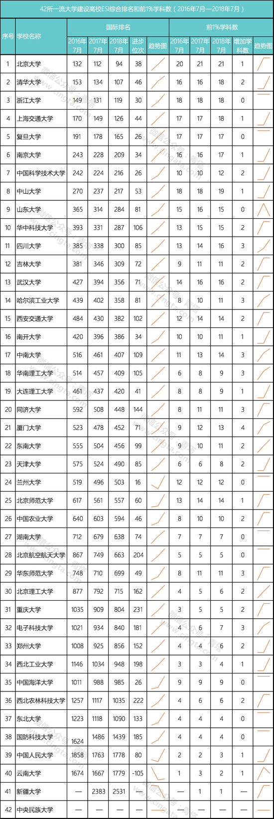 本部分青塔整理了2016年7月、2017年7月和2018年7月共三次ESI綜合排名和學(xué)科排名數(shù)據(jù)。從統(tǒng)計(jì)數(shù)據(jù)來看,大多數(shù)一流大學(xué)建設(shè)高校ESI綜合排名保持增長態(tài)勢,部分高校綜合排名增長幅度很大,包括華中科技大學(xué)、西安交通大學(xué)、中南大學(xué)、華南理工大學(xué)、北京航空航天大學(xué)等。相對來說,大多數(shù)高校前1%學(xué)科數(shù)變化不大。