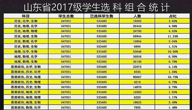 上述問(wèn)題,在理化生組合中基本不存在,在山東的選課數(shù)據(jù)中,這種理化生的“老理科”組合的人數(shù)排名第二,接近7萬(wàn)人,占比13.11%,無(wú)論是上課還是專業(yè)都不用擔(dān)心實(shí)際的困難,這個(gè)組合不僅能報(bào)理工科專業(yè),也可以報(bào)多數(shù)文史類專業(yè),選擇面很寬。