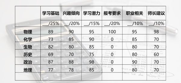 經(jīng)過各因素評(píng)價(jià),得分加權(quán)之后,最終比較各學(xué)科的總分,我們就可以獲得最為適合的選科組合。