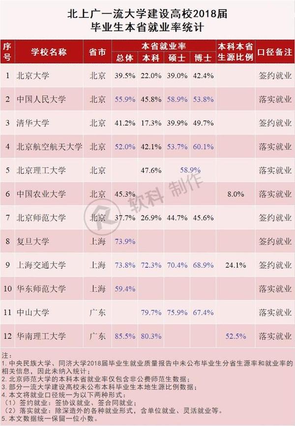 在高房價、落戶難等現(xiàn)實問題的壓力下,北京和上海依舊是本市畢業(yè)生的首選。2018年,中國人民大學和北京航空航天大學都有超過50%的畢業(yè)生選擇留京,北京理工大學畢業(yè)研究生留京比例接近60%。