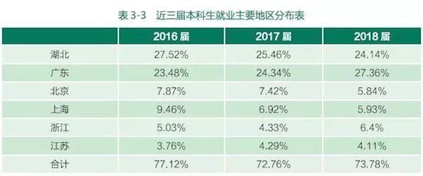 武漢大學近三屆本科生就業(yè)主要地區(qū)分布表