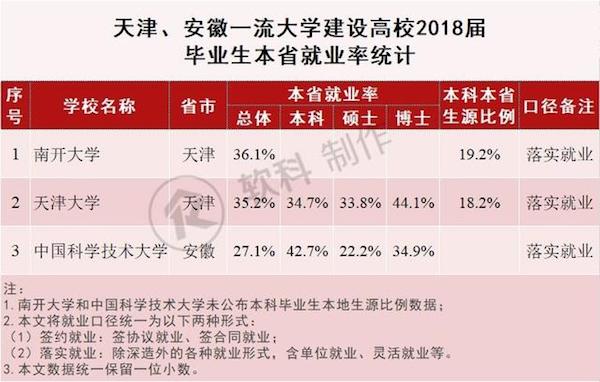 受到“江浙滬”等周圍省份的沖擊,安徽省在吸引本地人才方面略顯無力。雖然合肥也放寬了落戶條件、提供了3年個人租房補貼等優(yōu)惠政策,中國科學技術(shù)大學2018屆全體畢業(yè)生留在安徽的比例依舊僅約27%,有接近20%的畢業(yè)生就業(yè)地為上海。