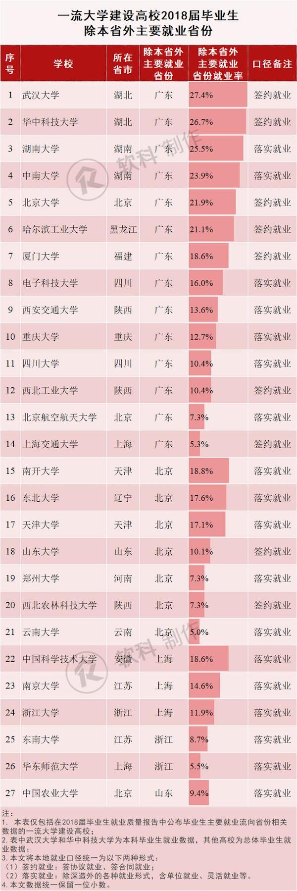 軟科查找到了27所一流大學建設(shè)高校學子除本省外的主要就業(yè)流向省份,其中有14所高校除本省外畢業(yè)生的主要流向省份是廣東,而武漢和長沙兩座城市的高校畢業(yè)生對廣東就業(yè)顯得格外執(zhí)著。