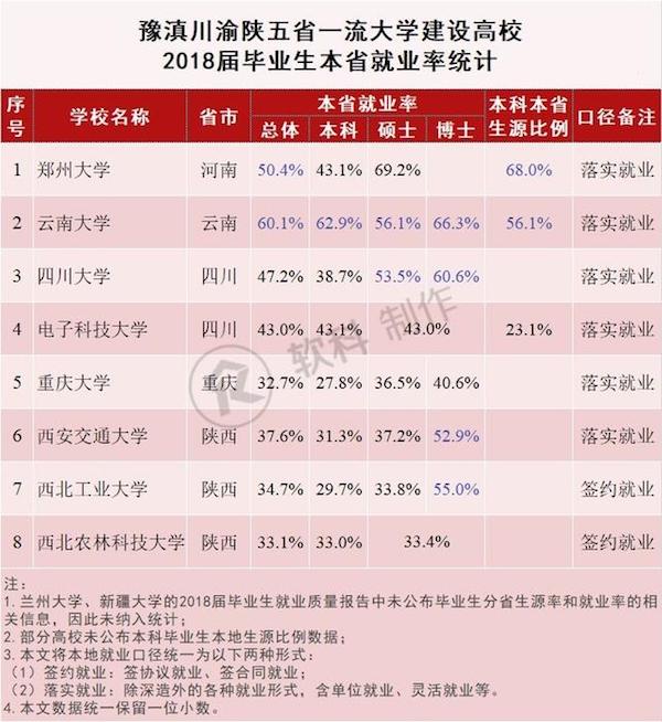 而同為一流大學建設(shè)B類高校的云南大學畢業(yè)生的本地就業(yè)率卻超過了60%,比其56%的本地生源要略高一些。云南的地理位置距離北京、上海等一線城市較遠,且云南的生活環(huán)境相對較為舒適,這可能云南比河南更容易留住人才的原因。
