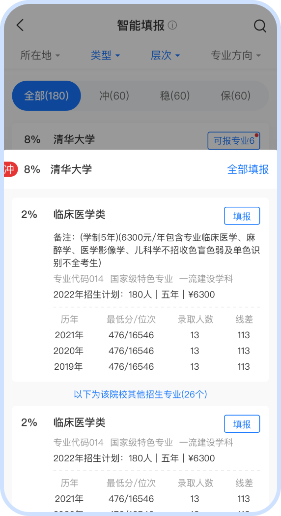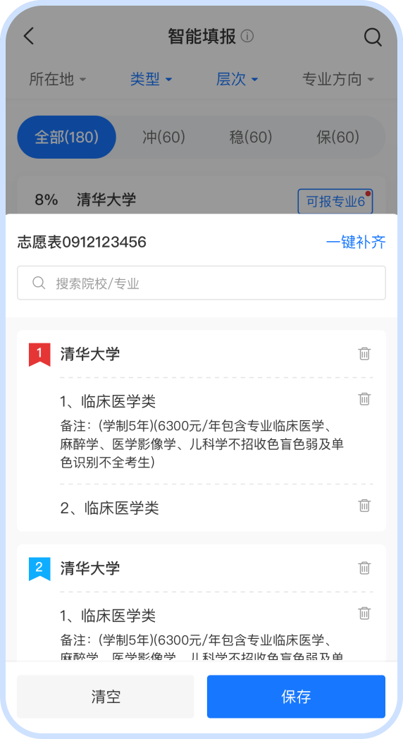 4.根據(jù)已選志愿及篩選條件,支持一鍵補(bǔ)齊志愿表。