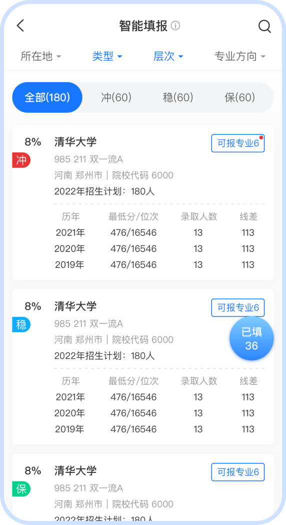 2.多維度篩選,滿足不同方向報考需求, 完成個性化報考方案。結(jié)合3年錄取數(shù)據(jù),預(yù)測志愿錄取概率,智能標(biāo)記沖、穩(wěn)、保,志愿有梯度,報考更科學(xué)。